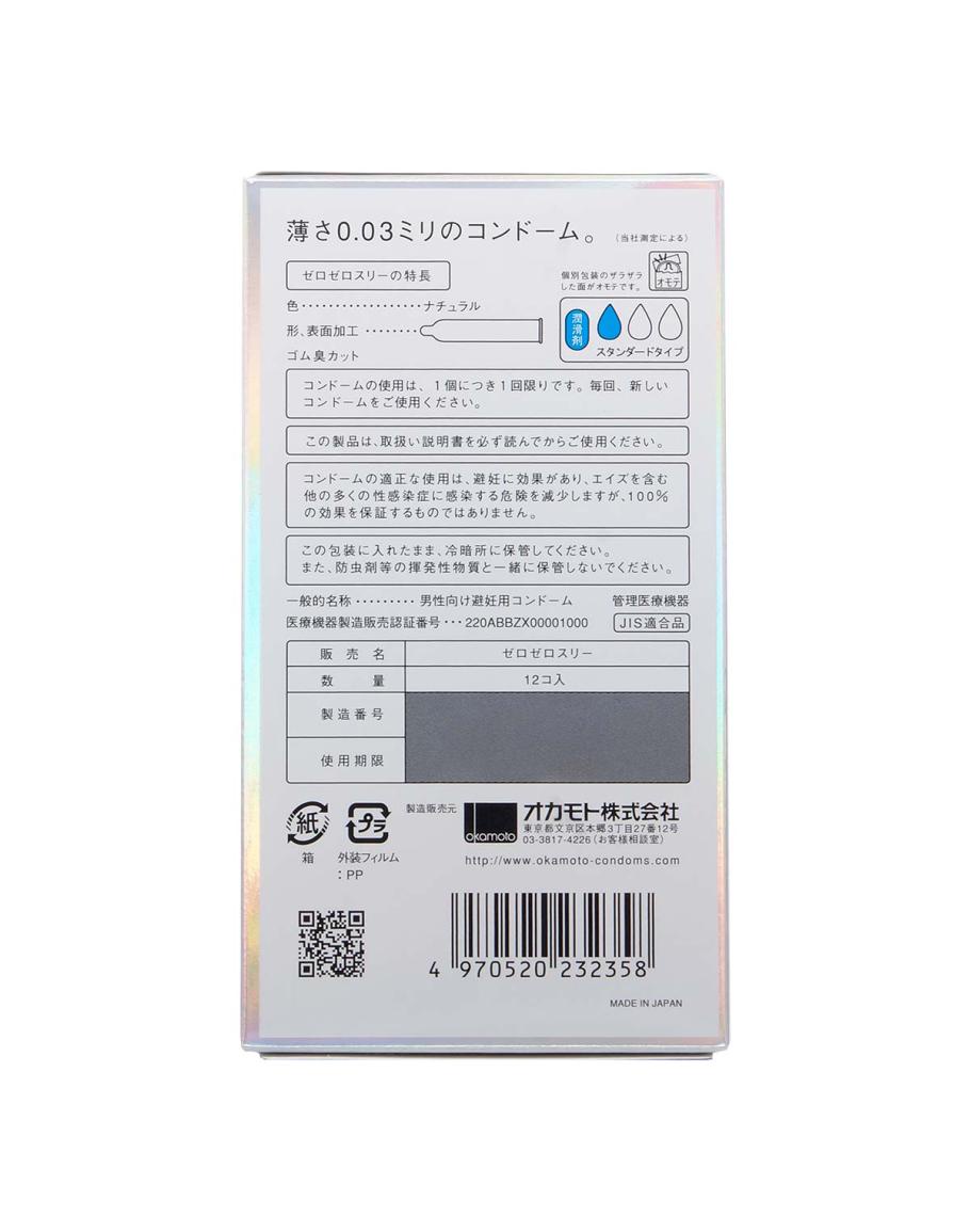 Okamoto 0.03 is one of the thinnest latex condoms on the market, with a thickness of just 0.03mm. Its snug fit is tailored to suit Asian body shapes, delivering a barely-there, natural sensation. Features odor-reduction treatment and non-spermicidal lubricant for a more comfortable and natural experience.