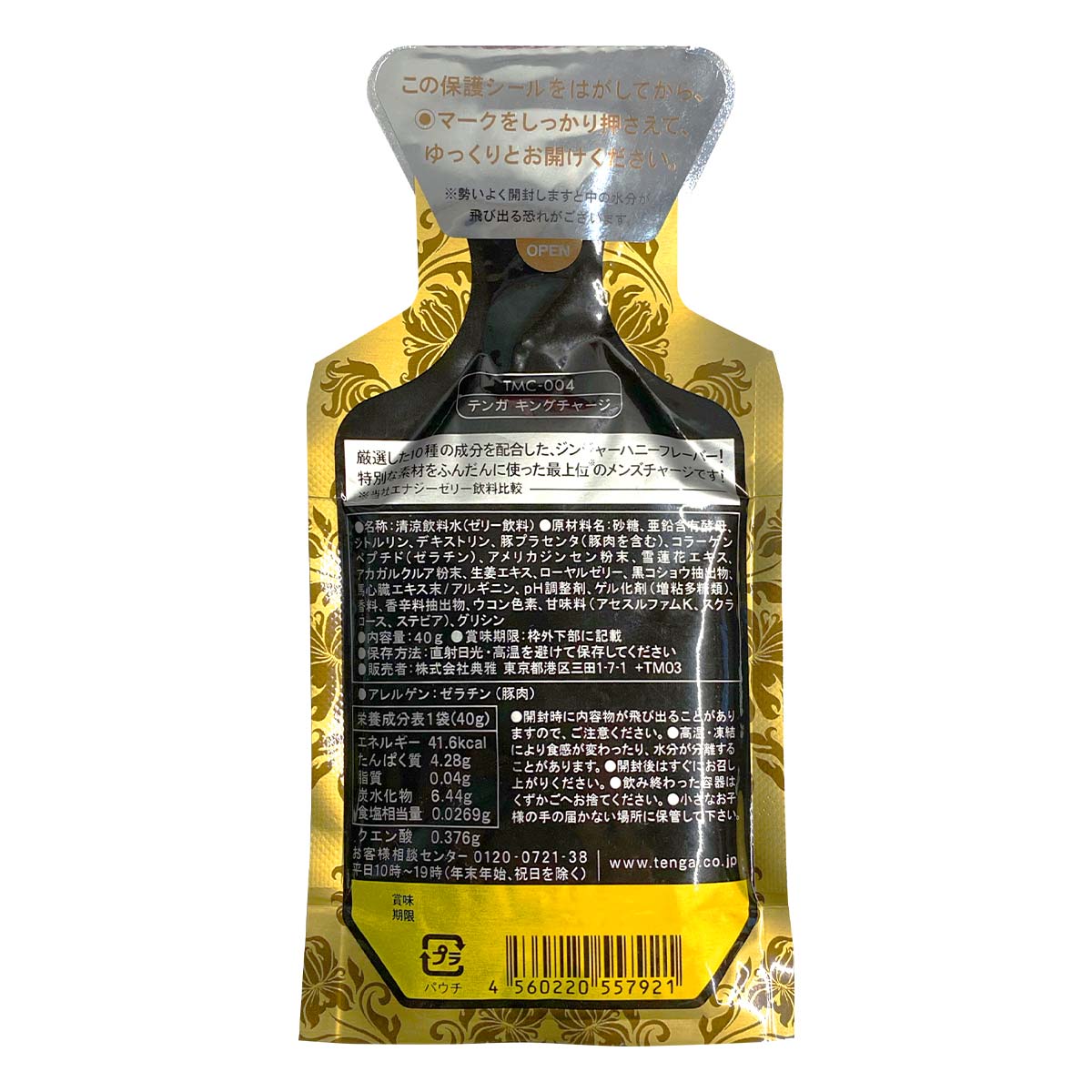 Introducing the ultimate premium formula from TENGA — TENGA KING CHARGE High Purity Energy Jelly Drink. Specially formulated for men, it combines 10 powerful ingredients including Royal Jelly, Pig Placenta, Horse Heart Extract, American Ginseng, and Snow Lotus. Infused with a warm honey-ginger flavour, each 40g pack delivers concentrated nutrients for rapid energy replenishment, helping you perform at your best before a date, workout, or any high-demand moment.